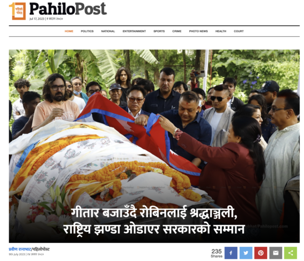 काठमाडौं : गायक रोबिन तामाङको आज अन्त्येष्टी गरिँदैछ। ६० वर्षीय रोबिनको मंगलवार साँझ काठमाडौंस्थित बुढानिलकण्ठमा उनकै निवासमा निधन भएको थियो।