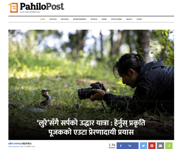 ‘एघारको परीक्षा चलिरहेको थियो। पोखराबाट ६५ किलोमिटर टाढाको स्याङ्जाबाट फोन आयो,’ उनले कोब्रा उद्धारको कहानी थाले, ‘हप्ता दिनसम्म पनि घर नजिकै घुमिरहने सर्पको फोटो हेर्दा थाहा भयो किङ कोब्रा।’