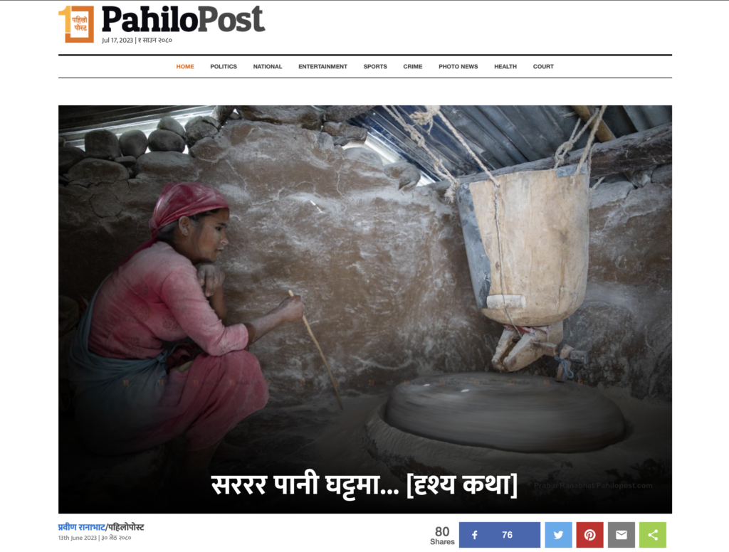 प्रवीण रानाभाट/पहिलोपोस्ट 13th June 2023 | ३० जेठ २०८० घुमिरहेको घट्ट र पानीको एकोहोरो आवाज। टिनको छतमुनि व्यस्त छिन् विपना। उडेको पिठोले उनको अनुहारदेखि टाउकाको सप्को पनि ढाकिनै लागेको छ। यो दृश्य कथा बाजुराको हो। बीस वर्षीया विपना थापाको रोजगारी यसैबाट चलेको छ। त्रिवेणी नगरपालिकामा रहेको उनको पानी घट्टले आधा घन्टामा २५ किलो मकै पिस्छ। त्यसैबाट उनको गुजारा […]
