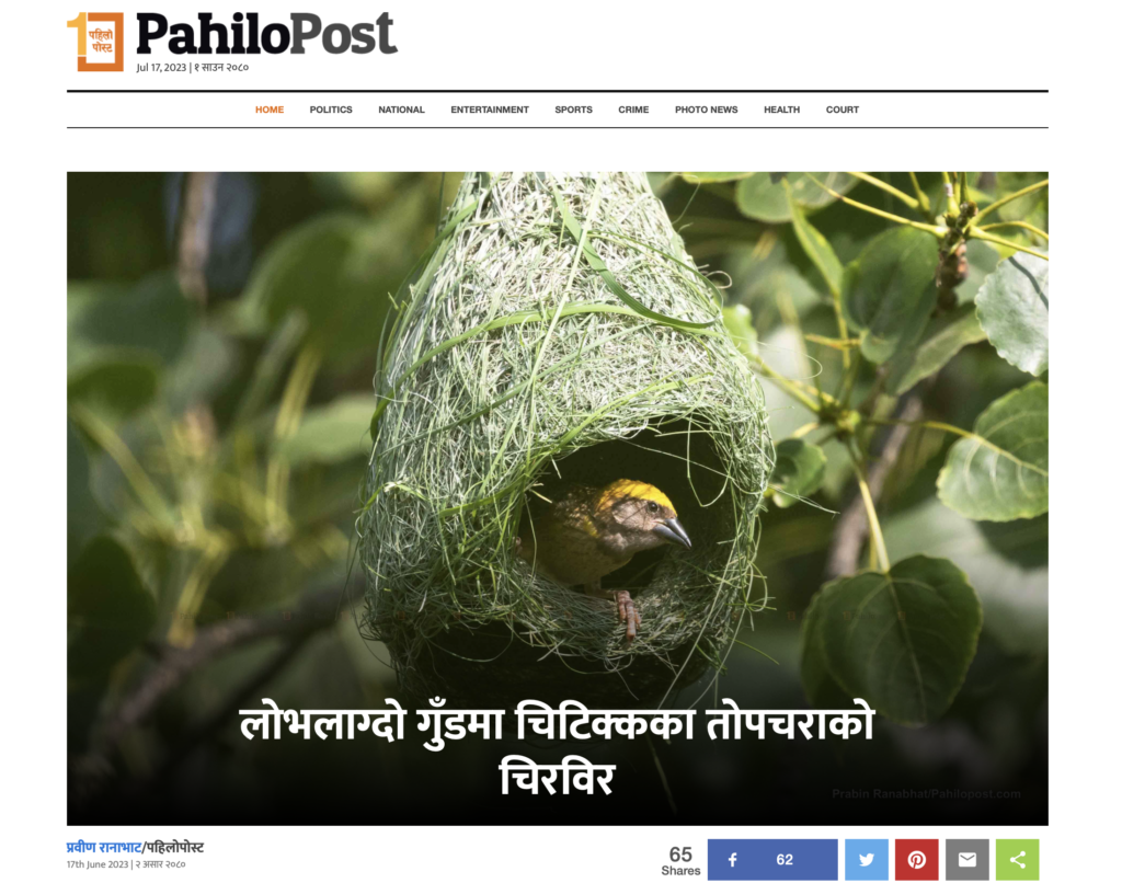 प्रवीण रानाभाट/पहिलोपोस्ट 17th June 2023 | २ असार २०८० 65Shares 62 तोप चरासँग अरु चराभन्दा फरक विशेषता छ। भँगेरा वर्गमा पर्ने यो चरालाई चराहरूको ‘इन्जिनियर’ पनि भनेर चिनिन्छ। कलात्मक ढंगले बनाउने यसको गुँडका कारण यसलाई इन्जिनियर चरा भनिने हो। रुखका टुप्पातिर झुन्डिएर रहेको यसको गुँडमा बचेरालाई सुरक्षित राख्न यसले धेरै नै मेहनत गरेको हुन्छ। तोप चराको गुँड सजिलै […]