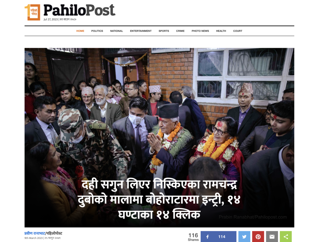 प्रवीण रानाभाट/पहिलोपोस्ट 9th March 2023 | २५ फागुन २०७९ 116Shares 114 काठमाडौं : बिहीवार बिहानैबाट बोहोराटारस्थित रामचन्द्र पौडेलको निवासमा घुँइचो लागेको थियो। शुभेच्छुक, नेता कार्यकर्ता शुभकामना दिन पुगेका थिए। राष्ट्रपतिको उम्मेदवार रहेका पौडेल ८ बजेतिर खाना खाइवरी निर्वाचनतिर जान तयारी गर्दै थिए। पौडेलको पछिल्लो लय हेर्ने हो भने उनी कुनै कुरा हतारमा गर्दैनन्। कडा प्रश्न सोध्दा पनि […]